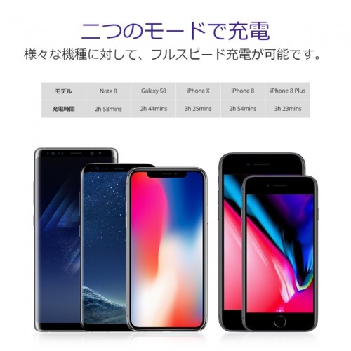 iPhone 8/ iPhone 8 Plus/ iPhone X/ Galaxy Note 8を始めとするQi規格に対応したスマートフォンの充電に対応。