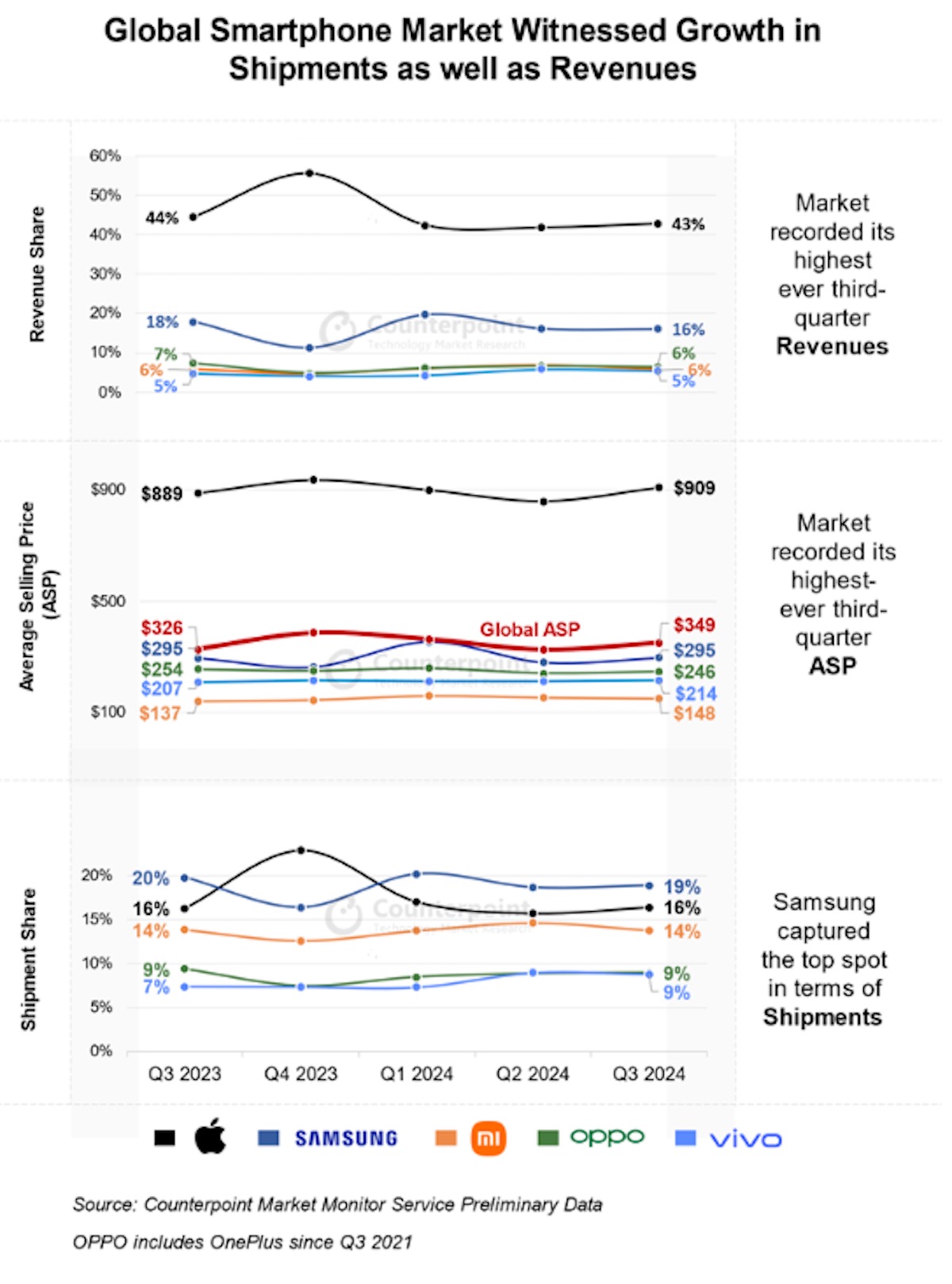 Counterpoint Researchによる2024年第3四半期スマートフォングローバル市場における出荷量調査で、グローバルでは前年比プラス3%となっています。