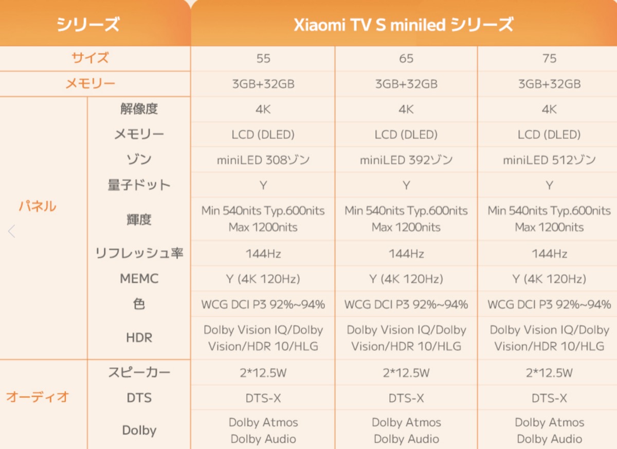 あと、テレビ製品シリーズでは、圧倒的に輝度が高いminiLED採用のXiaomi TV S Mini LEDシリーズも出ています。