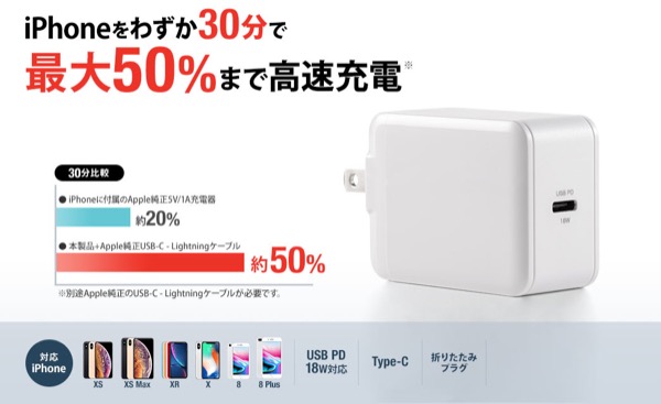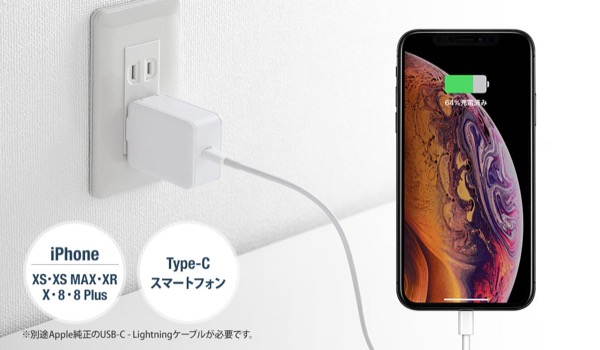 iPhoneを30分で最大50%充電可能なPower Delivery対応AC充電器「700-AC024」