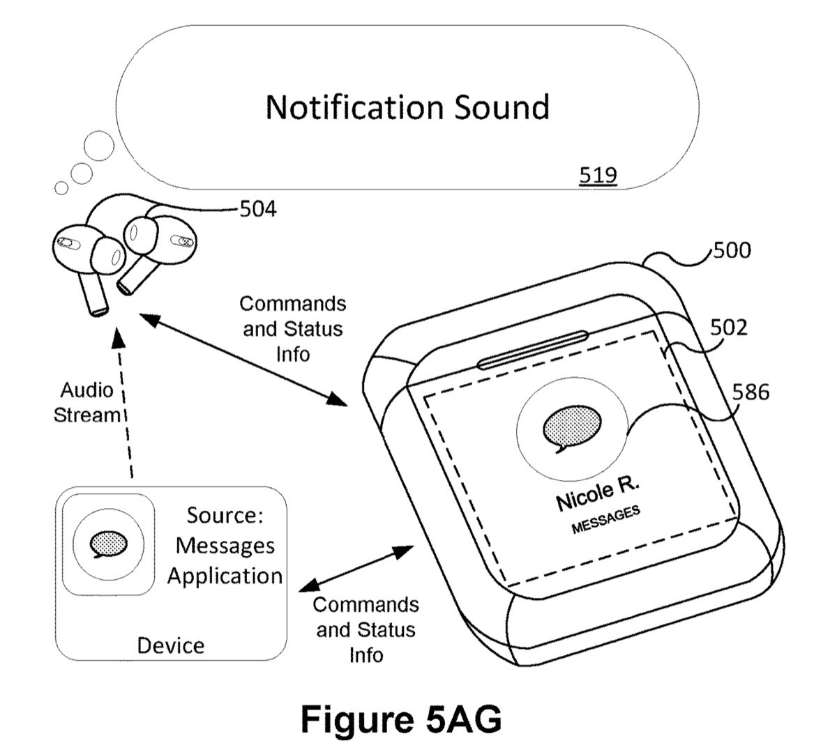 iPhoneに相当すると思われるデバイス、AirPods本体、ケースの3つが、それぞれステイタスやコマンドをやり取りし、AirPodsケースに搭載されたディスプレイでは再生コントロールのアイコンが表示。
