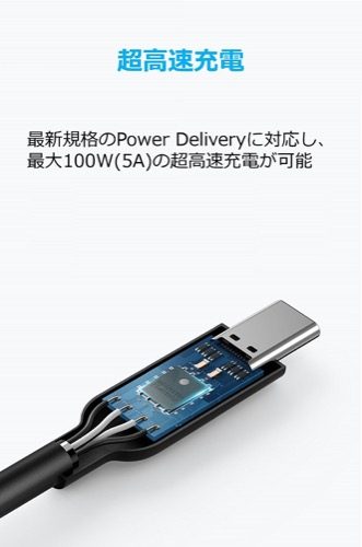 最大3A出力でのQuick Charge 3.0対応機器での高速充電、Power Delivery対応で最大100W(5A)の出力にも対応しています。