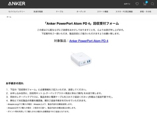 対象製品を使用している場合には、「Anker PowerPort Atom PD 4」回収受付フォームから回収と返金の手続きを行うことができます。
