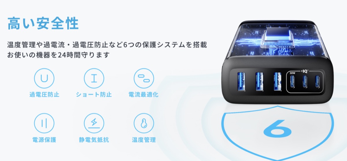 ・温度管理や過電流・過電圧防止ショート防止など6つの保護システム