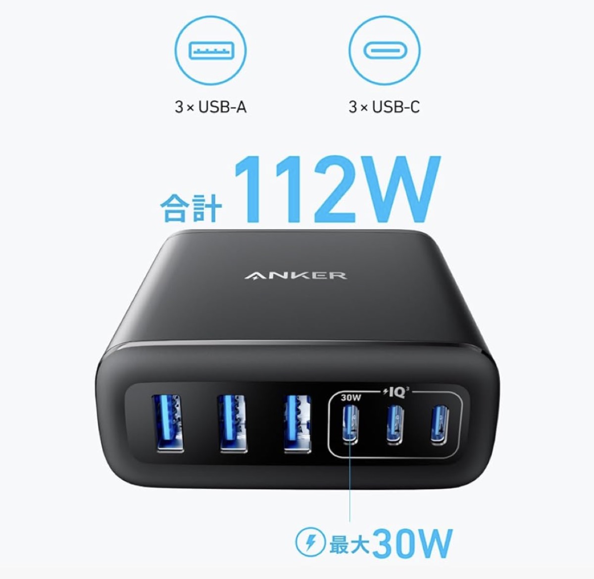 「Anker Charger (112W, 6 Ports, GaN) 」のブラックカラー追加。