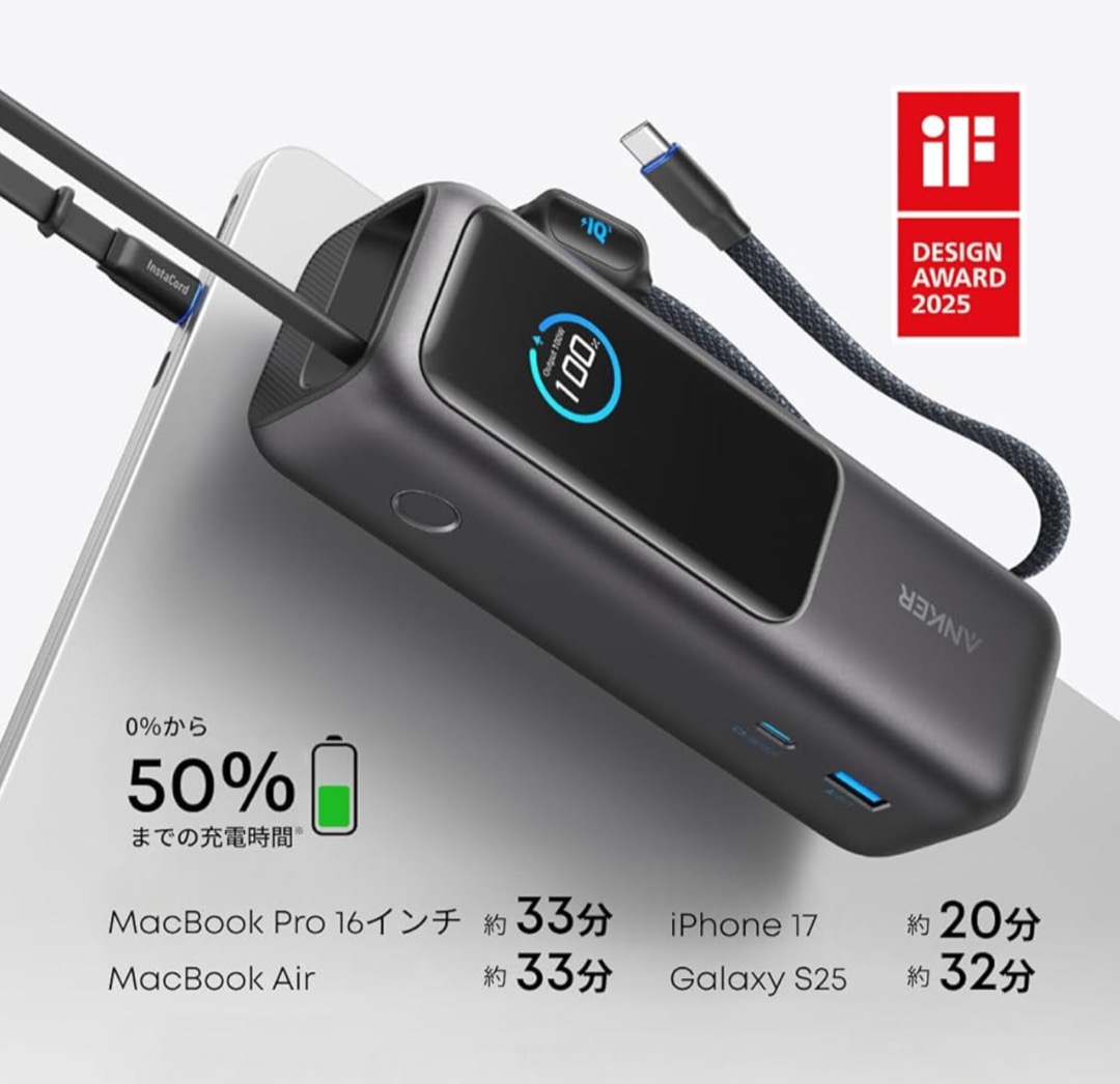 25,000mAhの大容量、さらにケーブル内蔵のモバイルバッテリー。MacBook ProをPD充電できる165W出力は、ヘビーユーザーには特に嬉しいスペック。ケーブルを別途持ち歩かなくていい点も便利。
