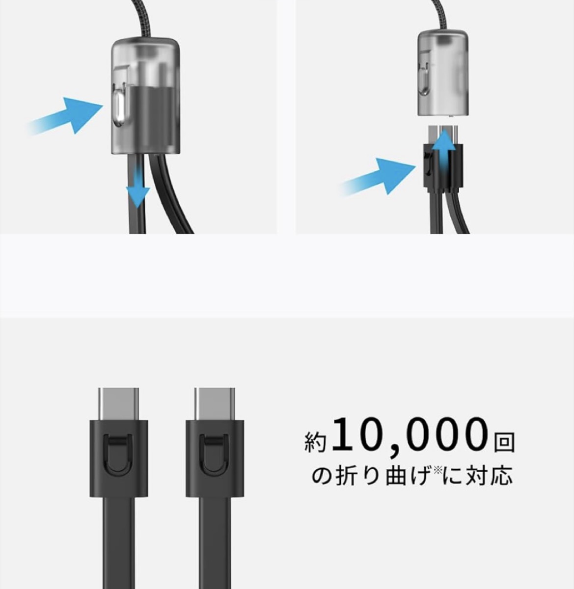 USB-Cケーブルは約10,000回の折り曲げ耐久性があります。