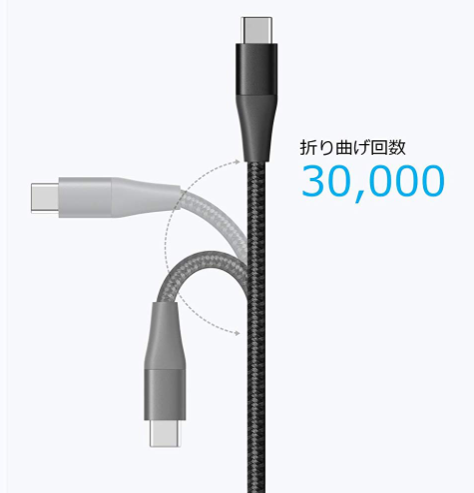 「Anker PowerLine+ II」は、30000回以上の折り曲げテストをクリアし、一般的なケーブルより30倍以上の耐久性を備えるUSB-C & USB-A 2.0ケーブルです。