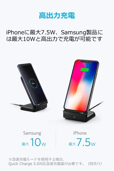 QC 2.0 / 3.0対応急速充電器を使用することで、iPhoneは最大7.5W出力、Samsung製スマートフォンの主要モデルは最大10W出力の急速充電が可能。