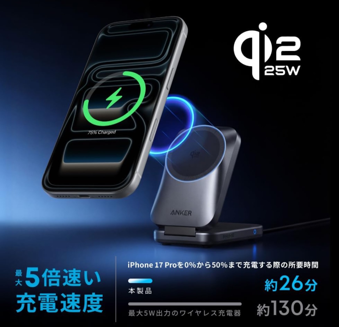 最大の特徴は、Qi2 25W認証取得済みであること。対応スマホであれば最大25Wでのマグネット式ワイヤレス充電が可能で、iPhone 17 Proを約26分で50%以上充電できます(5W比で約5倍の速さ)。
