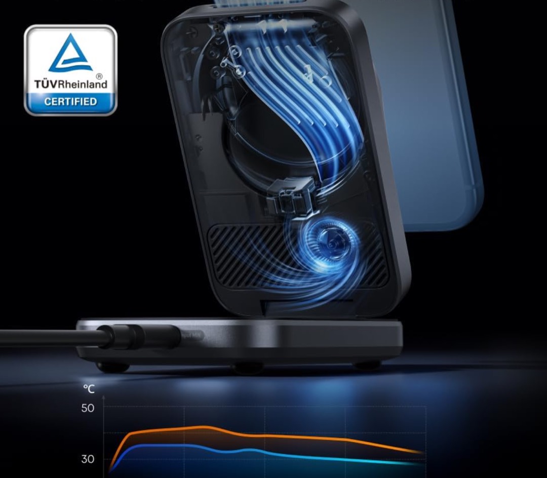 「Cicada Wing(セミの羽)」をモチーフにしたバイオミメティック気流設計により、わずか19dBの静粛動作を実現しています。スマホ表面温度を37°C以下に維持して、充電速度の低下(サーマルスロットリング)を防ぐ仕組みです。