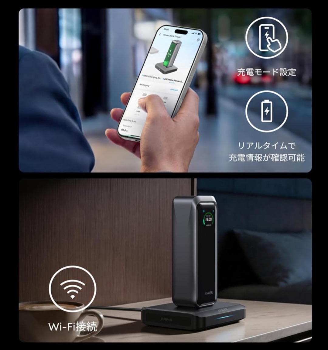 専用のAnkerアプリと連携することで、出力状況のモニタリングや充電モードの切り替えも可能。セット内容はバッテリー本体・充電スタンド・USB-C to USB-Cケーブル・電源コード。