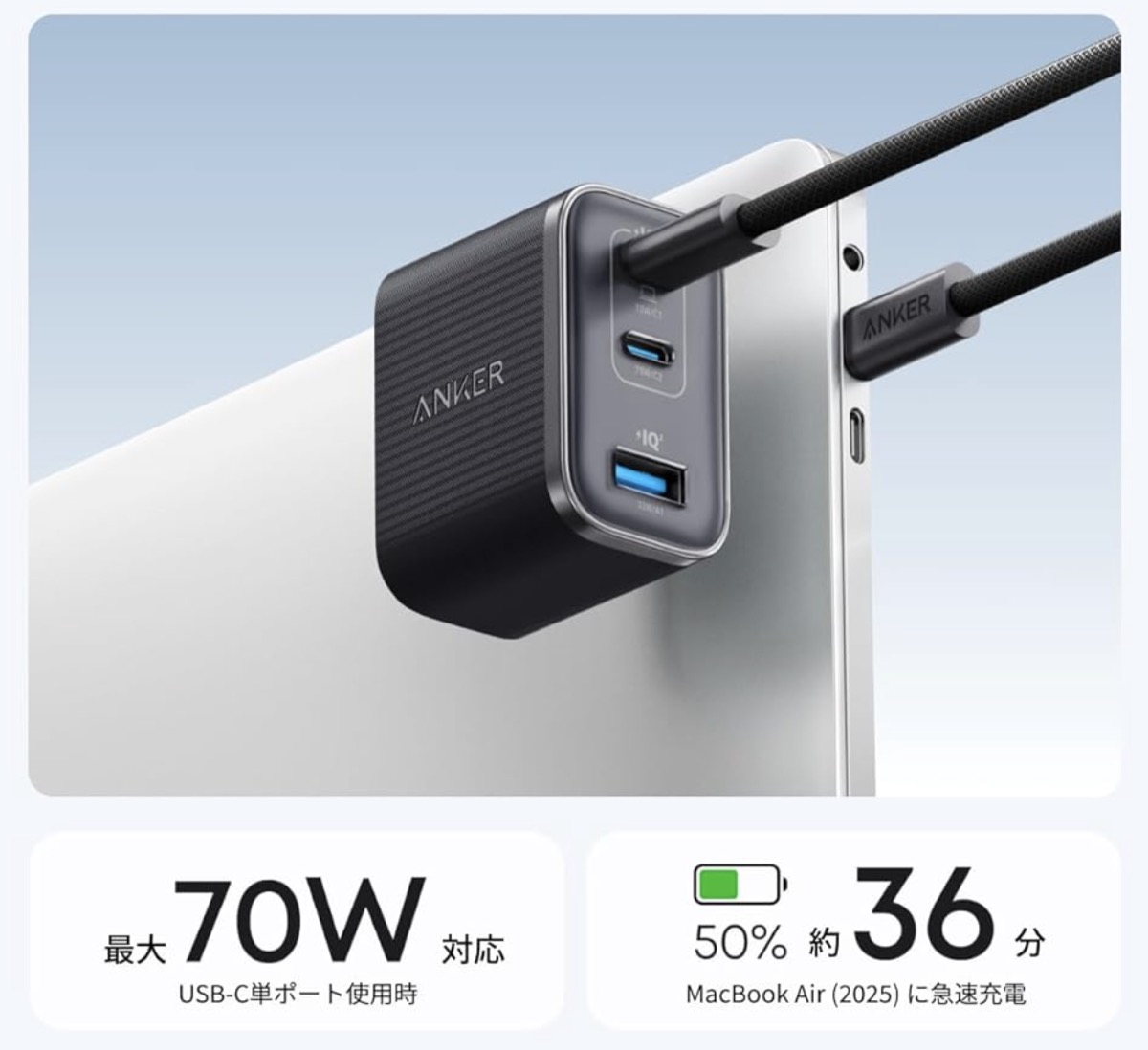 「Anker Nano Charger (70W, 3 Ports)」は、USB-Cポート×2とUSB-Aポート×1を備えた3ポート急速充電器。単ポート最大70W出力に対応し、MacBook Air含む幅広い機器で急速充電ができます。