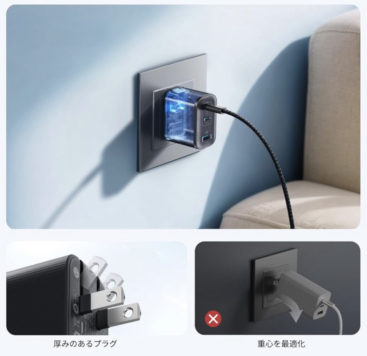 GaN(窒化ガリウム)技術を採用した高効率&低発熱設計で、国際安全基準より低温度で動作するなど安心感もあります。さらに、重心設計やプラグの厚みによる抜け落ちにくい構造、放熱性の高い表面加工など、細部の使い勝手にも配慮されています。