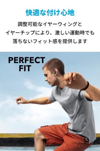 調整可能なイヤーウィングとイヤーチップにより、スポーツ時でも落下しにくい構造となっています。