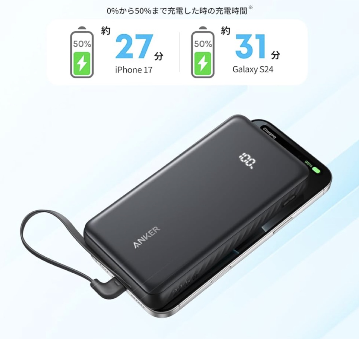 このAnker Zolo Power Bankは、大容量+急速充電+内蔵ケーブルという分かりやすい利点を備えたモデル。