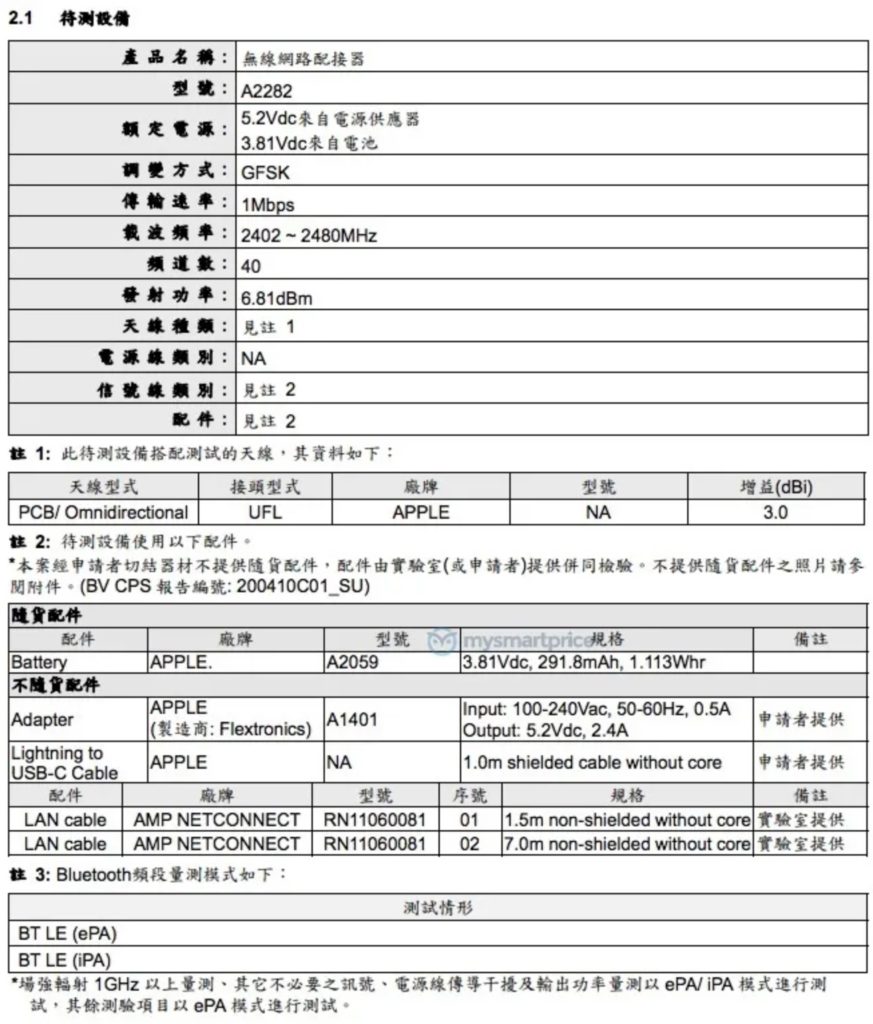この「A2282」は周波数帯1GHz以下で動作するWi-Fi、BT LE(Bluetooth Low Energy)を内蔵したネットワークアダプター。
