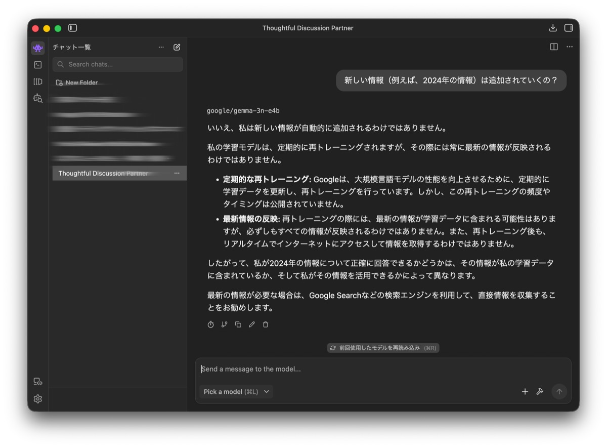 チャットAIでやっていたような”思考の壁打ち”にも使ってみたのですが、他の汎用LLMと比べてレスポンスが単純化されていて、深みがない。別視点の気づきもなく、例えると「たいして親しくもない知人と会話しているような感覚」でした。そのくせ、Macの処理性能・保存領域をしっかり圧迫します。
