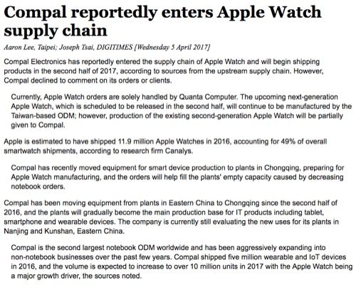 現在、Apple WatchのオーダーはQuanta Computerが仕切っていますが、次世代のApple Watchは今年後半にスケジュールされており、この製造に関しては、これまでと同様、台湾のODMが製造を手がける予定ですが、現在の第二世代のApple Watchは部分的にCompalが請け負う形になるとしています。
