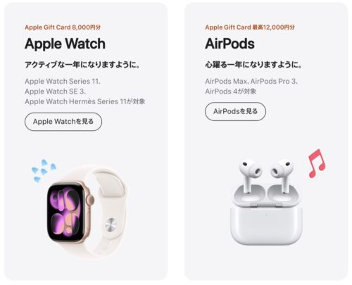 即時値引きではないものの、Apple Gift Cardは将来のアクセサリ購入やサブスク支払いにも使えるため、Apple製品を継続的に使う人にとっては実質的な還元ということになります。