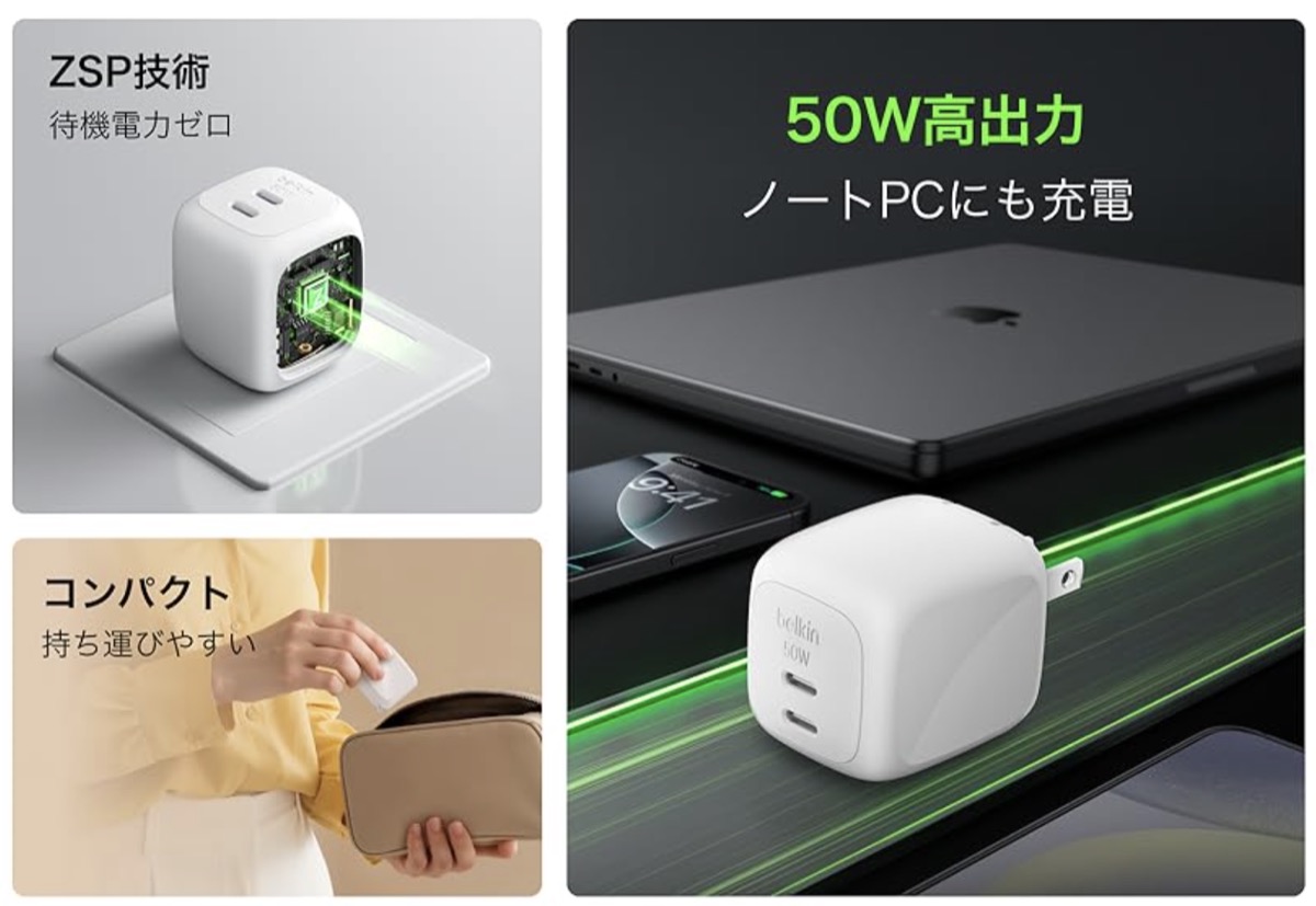 充電していない時にはミリワット級ゼロ消費電力モードになる「Belkin Cubic Charger 50W, 2-Port」発売[次世代D-Mode GaN搭載]