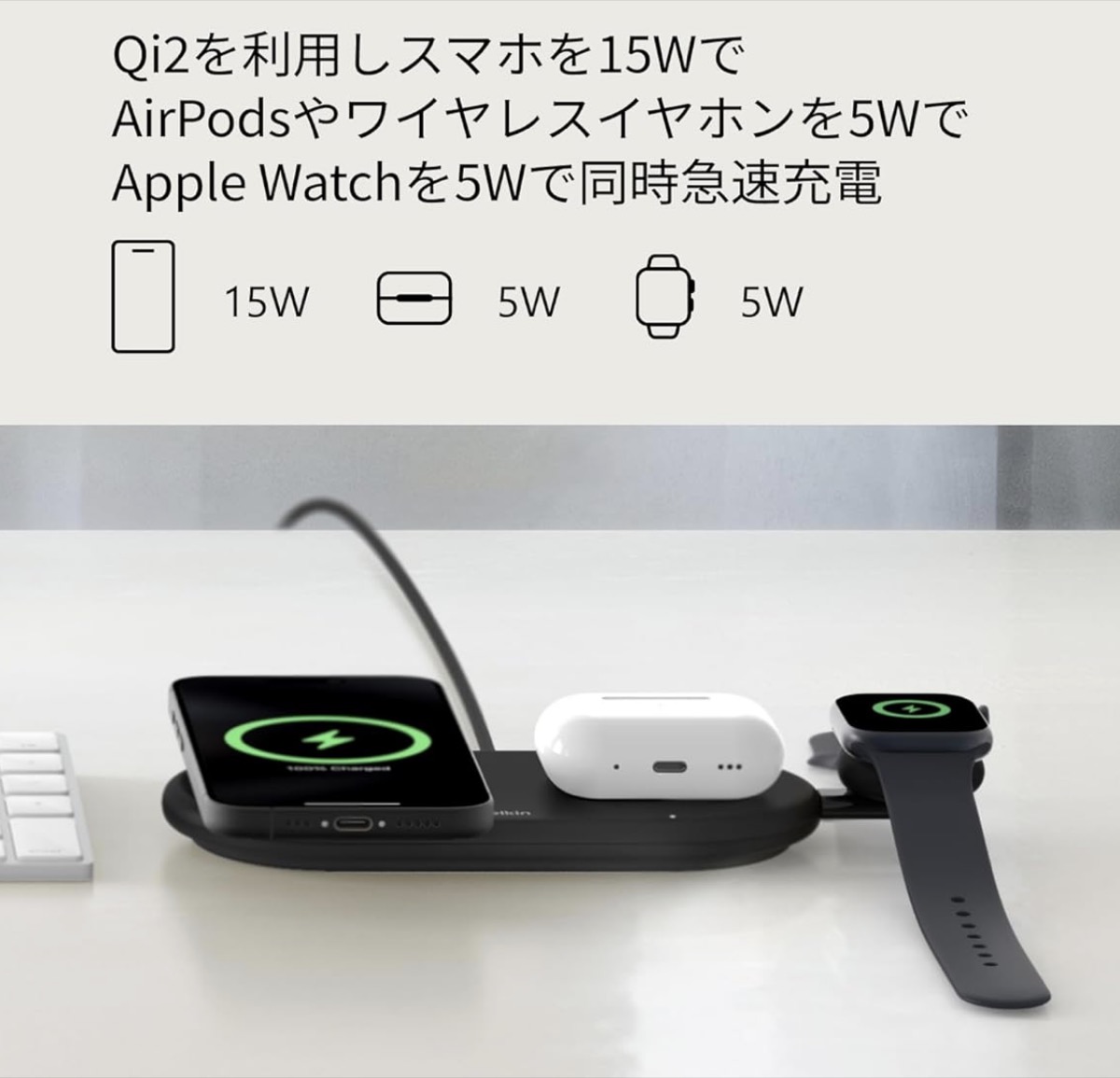 Apple Watch急速充電ドングル付き、3台同時充電できるQi2充電器「Belkin Qi2 3-in-1ワイヤレス充電パッド」発売