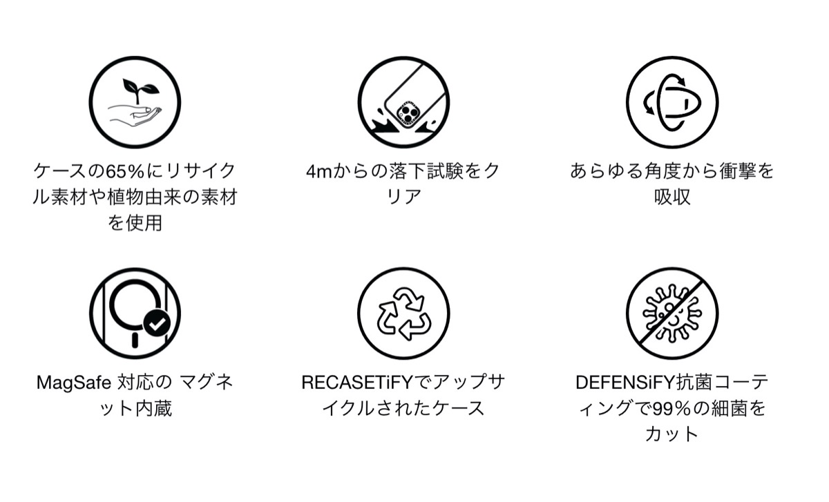 原料の65%にリサイクル素材と植物由来の素材が使われているサスティナブルなケースで、MagSafe対応。MagSafe充電器などに対応しています。