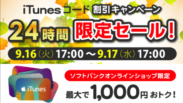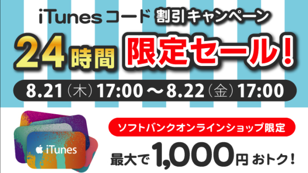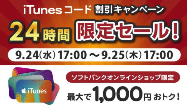 ソフトバンク・オンラインで,24時間限定のiTunes コード最大1,000円OFFセール