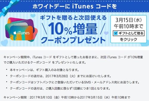 ソフトバンク、ホワイトデーにiTunesコードを送ると次回10%増量で購入できるキャンペーン