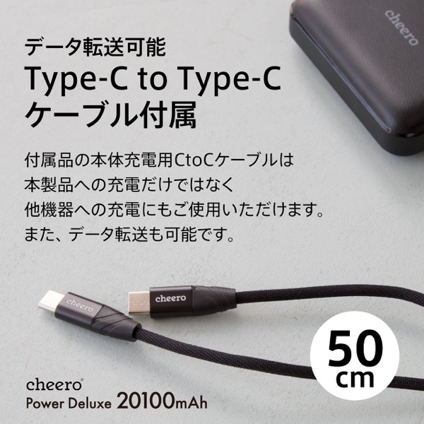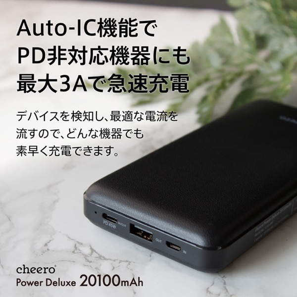 「cheero Power Deluxe 20100mAh」は、Power Delivery 45Wまでに対応する、高速充電が可能な20100mAhモバイルバッテリーです。