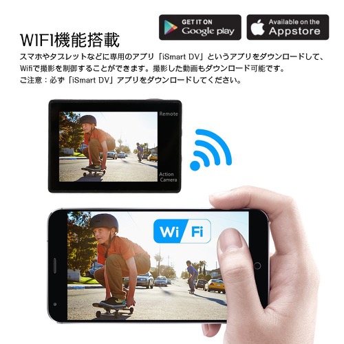 Wi-Fi接続で、iPhone/Androidスマートフォンから「iSmart DV – iCatch Technology Inc.,」「iSmart DV – Google Play の Android アプリ」アプリをインストールし、接続すると、録画や写真撮影ができるようになります。