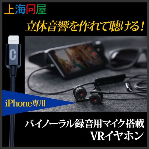 上海問屋が,iPhone専用のバイノーラル録音用マイク搭載 VRイヤホン「DN-915037」を発売しています。9,999円です。