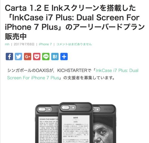 「Carta 1.2 E Inkスクリーンを搭載した「InkCase i7 Plus: Dual Screen For iPhone 7 Plus」のアーリーバードプラン販売中」(2017年7月8日)