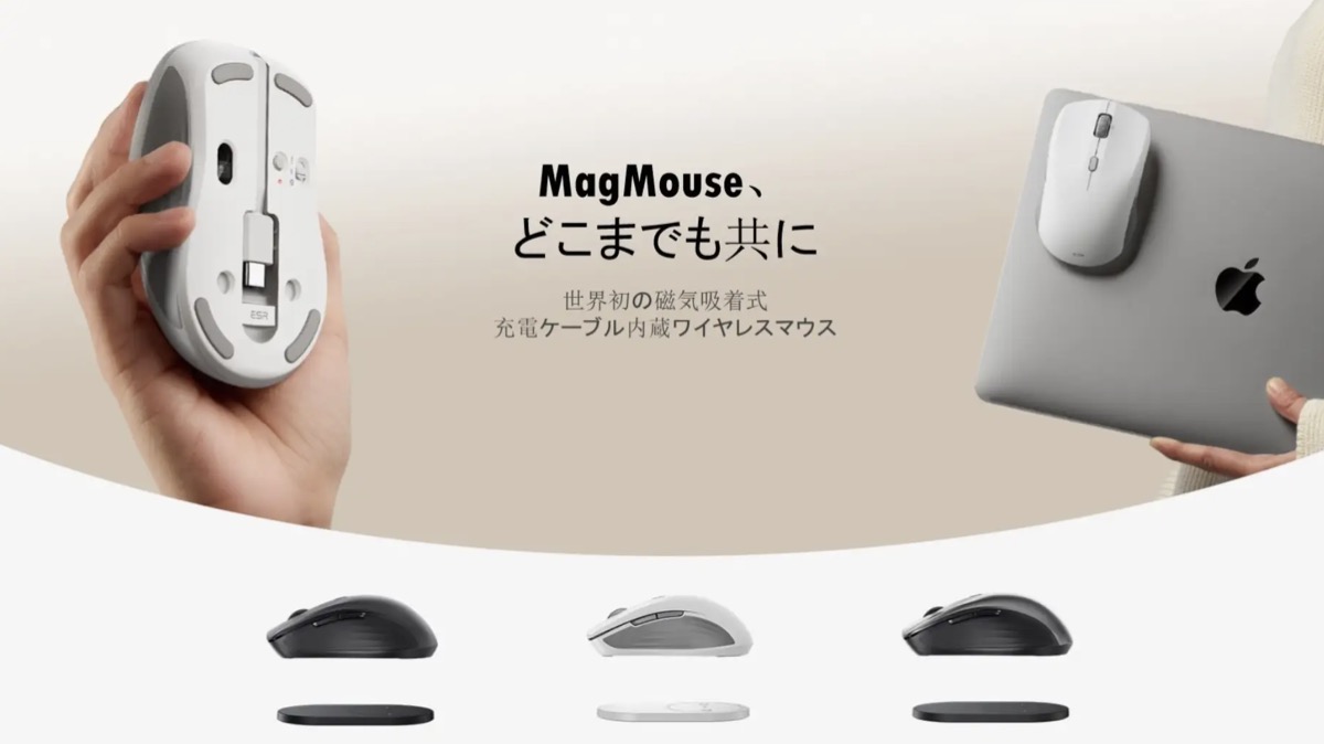 「ESR HaloLock MagMouse™ワイヤレスマウス」は、マグネットで取り付けられるベースがもしかしたら便利かも。