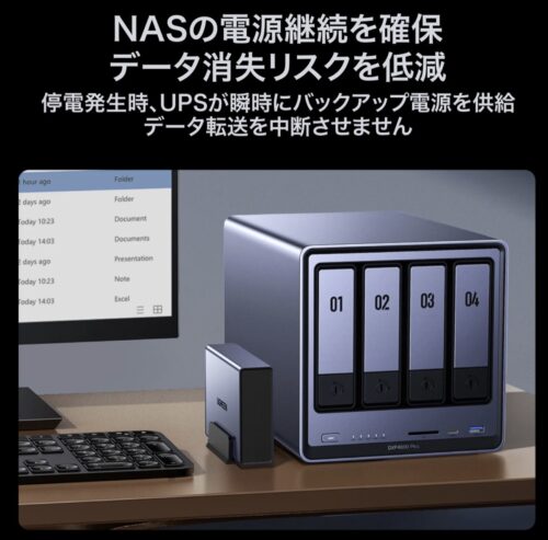 NASはRaid構成にしてミラーリングすれば、データ破損の可能性を小さくできますが、加えてUPSを使うことでNAS本体の電源瞬断というトラブルにも備えられるので、さらに安全度が増します。