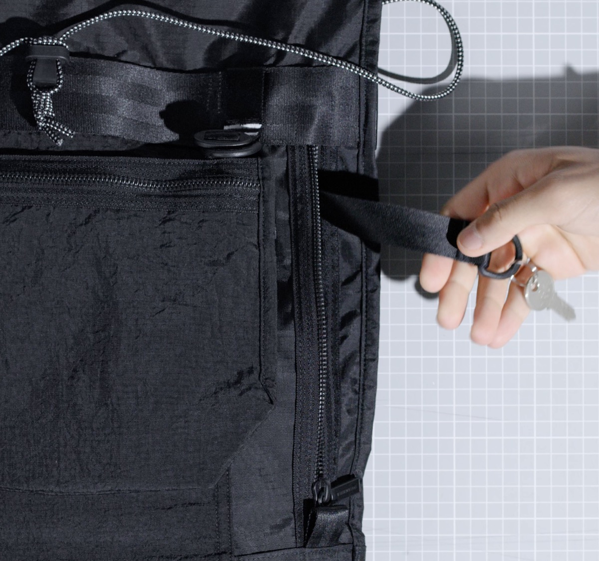 メインコンパートメントにはキードッキングループ、ショルダーストラップにもキーループ。