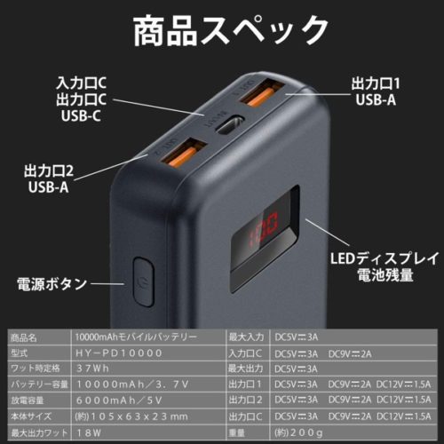 「HY-PD10000」は、最大18ワットのPower Delivery対応で、200グラムの