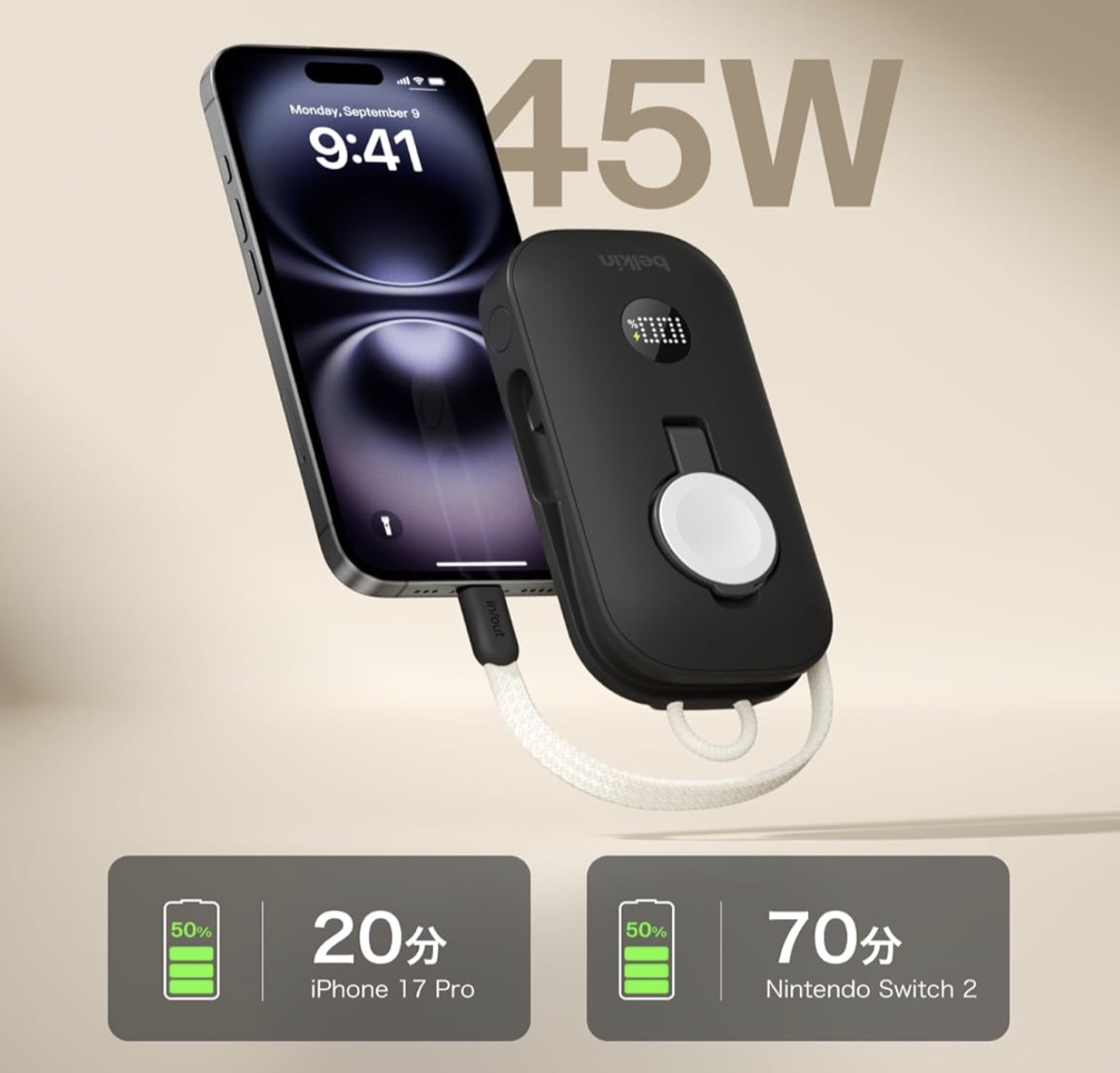 価格は1.4万なので、モバイルバッテリーとしては高めにも思えるけど、ベルキン製品で、Apple Watchモジュール内蔵の10,000mAhバッテリー、デジタルスクリーン、MacBookでも使えるというあたりで唯一の選択肢になります。