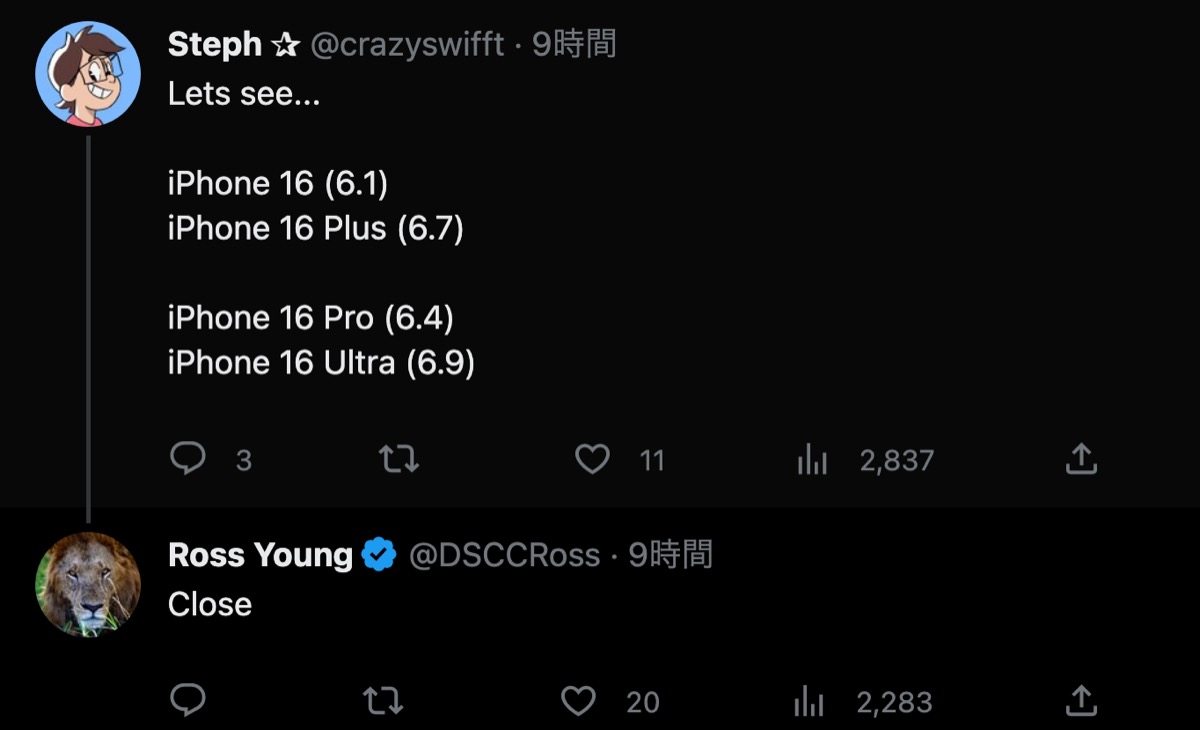 この関連で「6.2x” and 6.8x”…」「iPhone 16 Proモデルでアスペクト比が若干上昇する」ともツイートしています。
