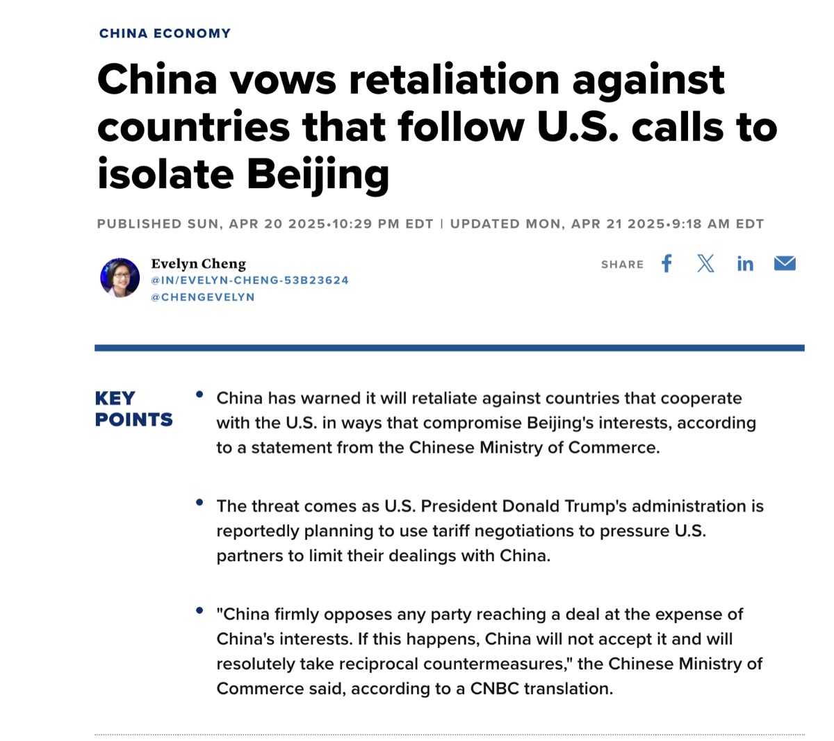 直訳で「中国は、米国の北京孤立化の呼びかけに従う国々に対して報復を誓う」というCNBCの記事では、”中国は自国の利益を損なう形で米国と協力する国に対して報復すると警告”していると伝えています。