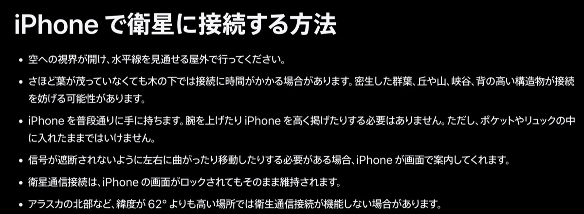 携帯電話キャリアの電波やWi-Fiが届かないところでも、iPhoneから衛星通信に接続して、緊急通報サービスにテキストメッセージを送ったり、ロードサービスを手配したり、自分の居場所を友人や家族に知らせたりできる、というもの。