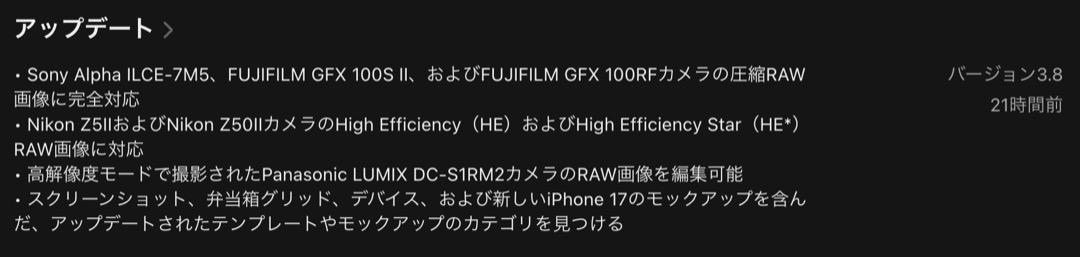 Pixelmator Proはミラーレスの新型機に対してRAWサポートが早いですね。今回のSony・FUJIFILM・Nikonへの対応もその流れ。iPhone 17モックアップの追加は、アプリのスクショ素材づくりをPixelmator Proで完結させたい人には地味に便利だと思われます。