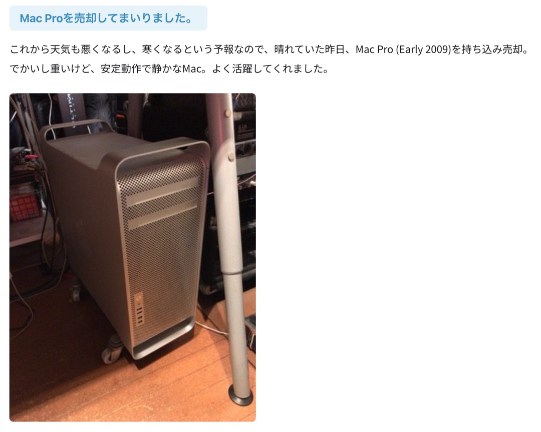 僕もEarly 2009を使っていた時期があります。夢のような拡張性で、自分で開けて、整然と設計されたマザーボードやらなんやらを取り外して、クリーニングしたこともいい思い出です。