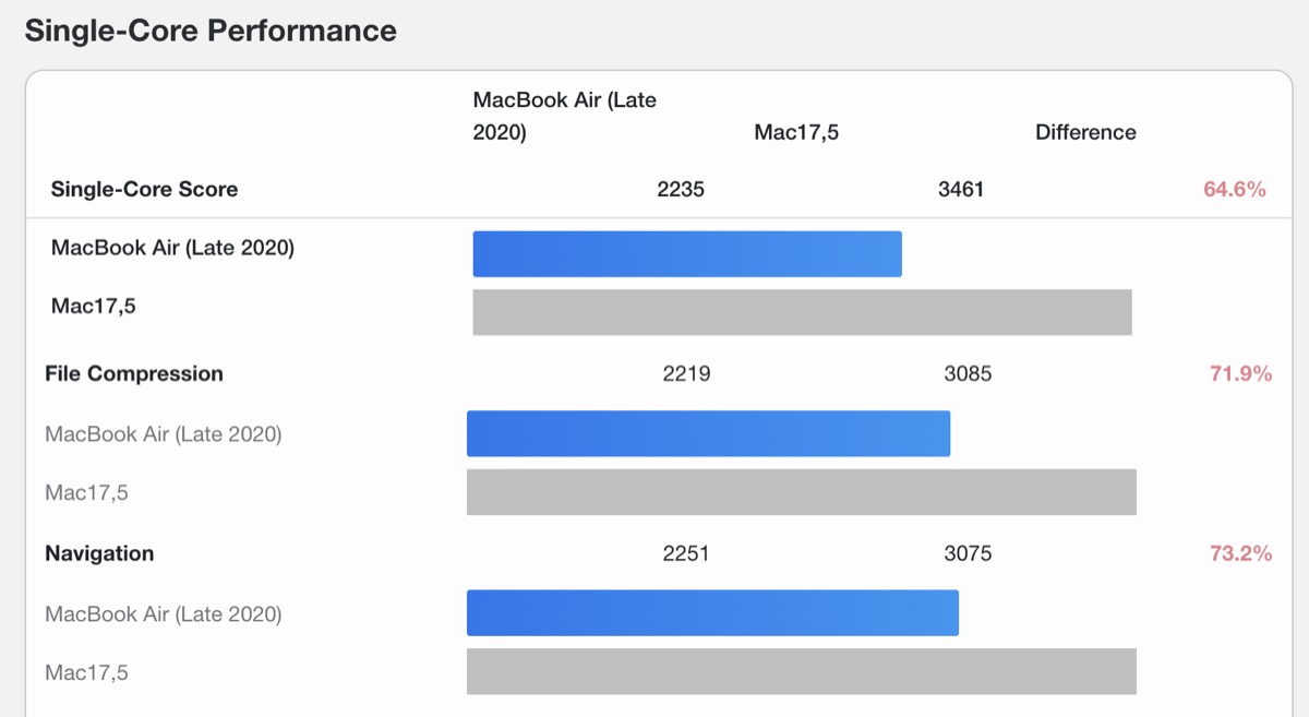 - シングルコアスコアはMac17,5が約64.6%上回る(2,235 vs 3,461)