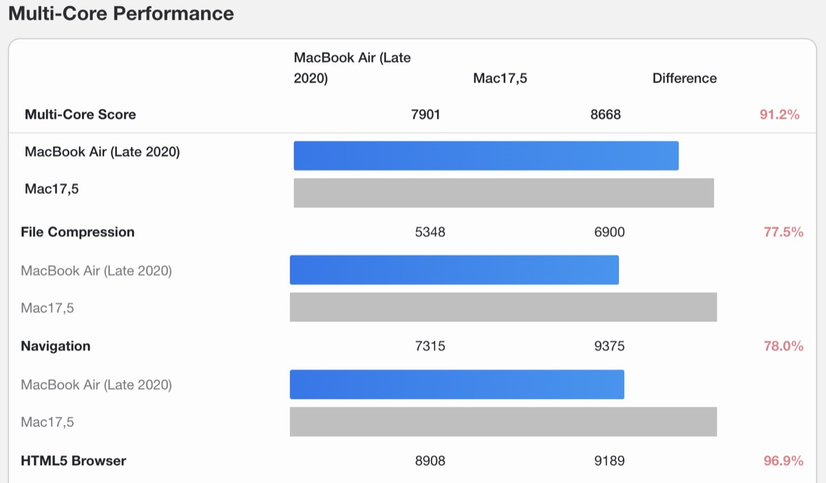 Geekbench 6のベンチマーク結果に、Mac17,5という未発表モデルのスコアが登録され、2020年発売のMacBook Air(M1)との比較データが公開されました。