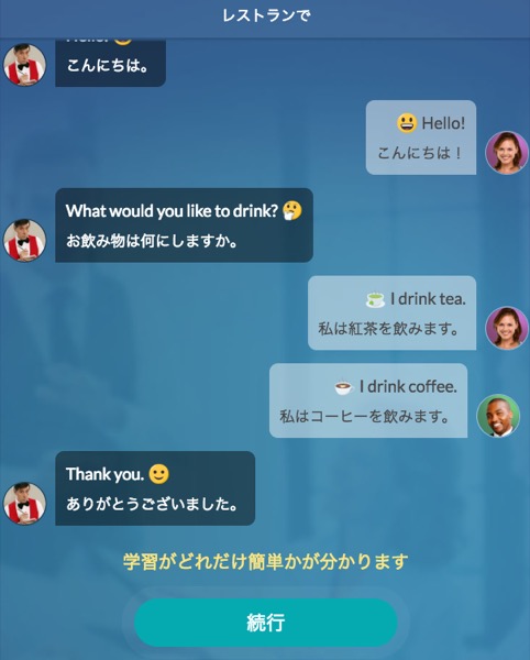 様々なシチュエーションでのよくある会話を例題に、学習したい言語の基礎力を向上することができ、レッスンをこなしていくとポイントが貯まり、統計や順位を確認することができます。