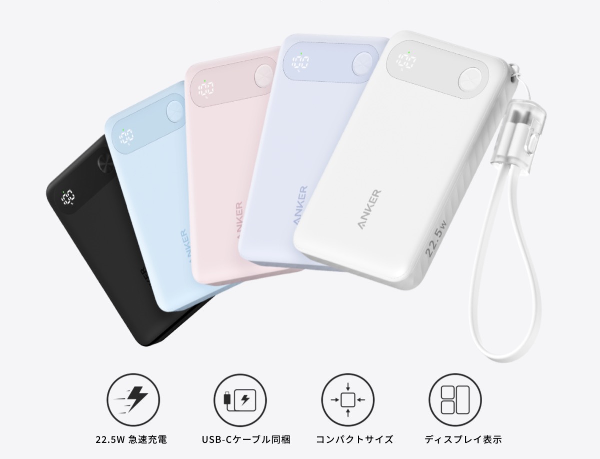 「Anker Power Bank (10000mAh, 22.5W) 」に新色、ブルー、ピンクが追加。