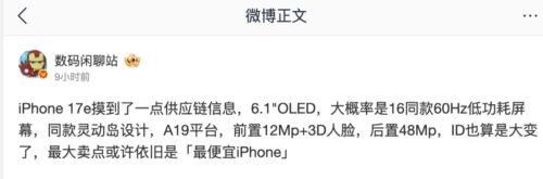 iPhone 17eのサプライチェーン情報がある。6.1インチのOLEDディスプレイ、おそらくiPhone 16と同じ60Hzの低消費電力スクリーン、同じSmart Islandデザイン、A19プラットフォーム、3D顔認識機能付き12Mpフロントカメラ、48Mpリアカメラを搭載している。IDも大きく変わった。最大のセールスポイントは、やはり「最も安いiPhone」かもしれない。