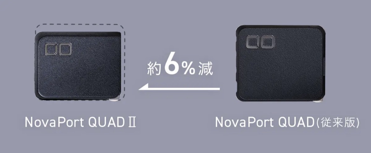 従来製品の「NovaPort QUAD 65W」よりも体積が約6%小さくなり、3ポートの「NovaPort TRIO」のサイズに近づいています。