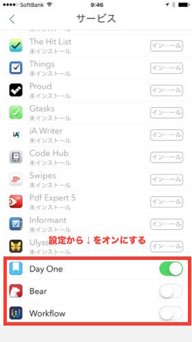 ↓設定に入って,サービスを開くと「Workflow」「Bear」がありましたのでオン。